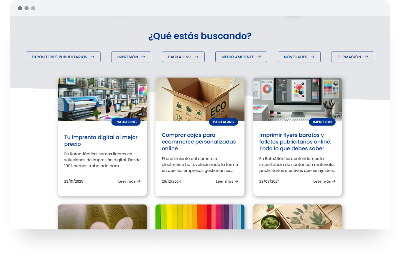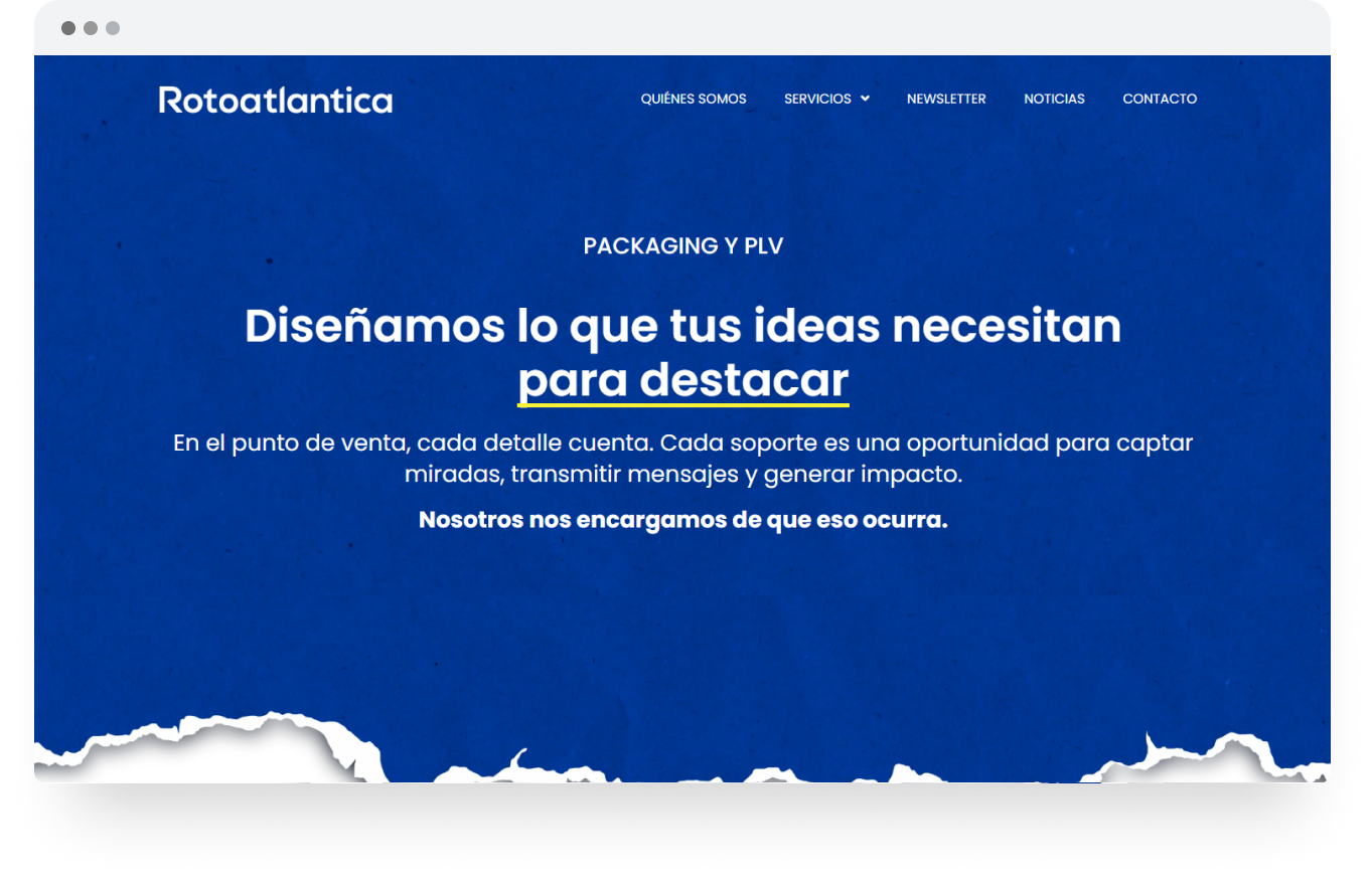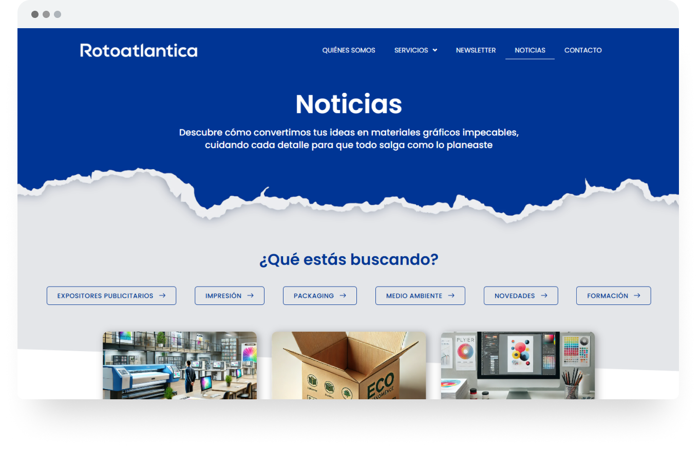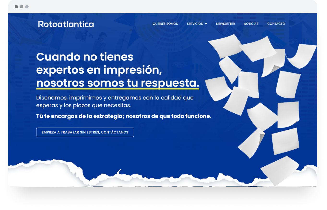 Rediseñar al completo la web de Rotoatlantica para mejorar su posicionamiento online y transmitir a través de sus nuevos textos y nuevo diseño sus años de experiencia en el sector de la impresión.